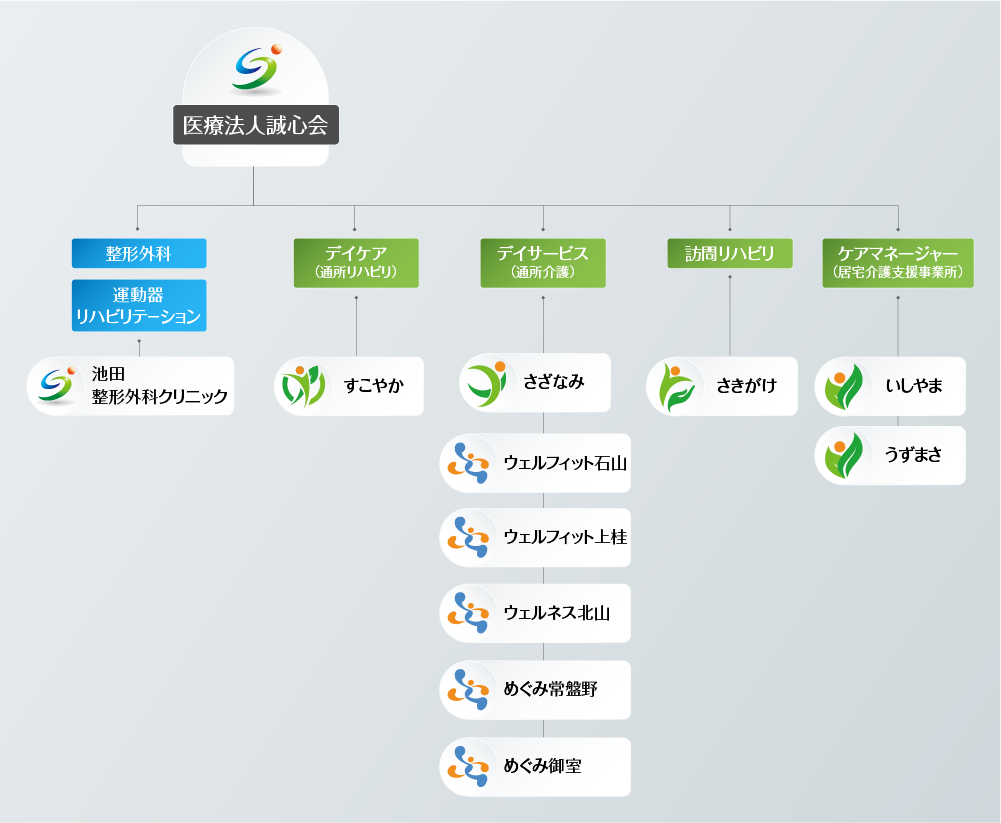 | 事業内容 | 医療・介護の提供 医療部門:整形外科・リハビリテーション 介護部門:居宅介護支援事業所(うずまさ、いしやま)・通所リハビリテーション(すこやか)通所介護(さざなみ、ウェルフィット上桂、ウェルフィット石山、ウェルネス北山)・訪問リハビリテーション(さきがけ)の8部門(関連法人含む)を運営しています。 |